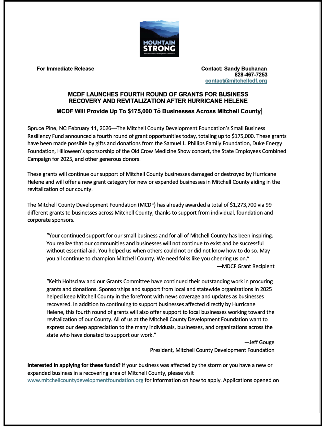 Spruce Pine, NC February 11, 2026—The Mitchell County Development Foundation’s Small Business Resiliency Fund announced a fourth round of grant opportunities today, totaling up to $175,000. These grants have been made possible by gifts and donations from the Samuel L. Phillips Family Foundation, Duke Energy Foundation, Hilloween’s sponsorship of the Old Crow Medicine Show concert, the State Employees Combined Campaign for 2025, and other generous donors.